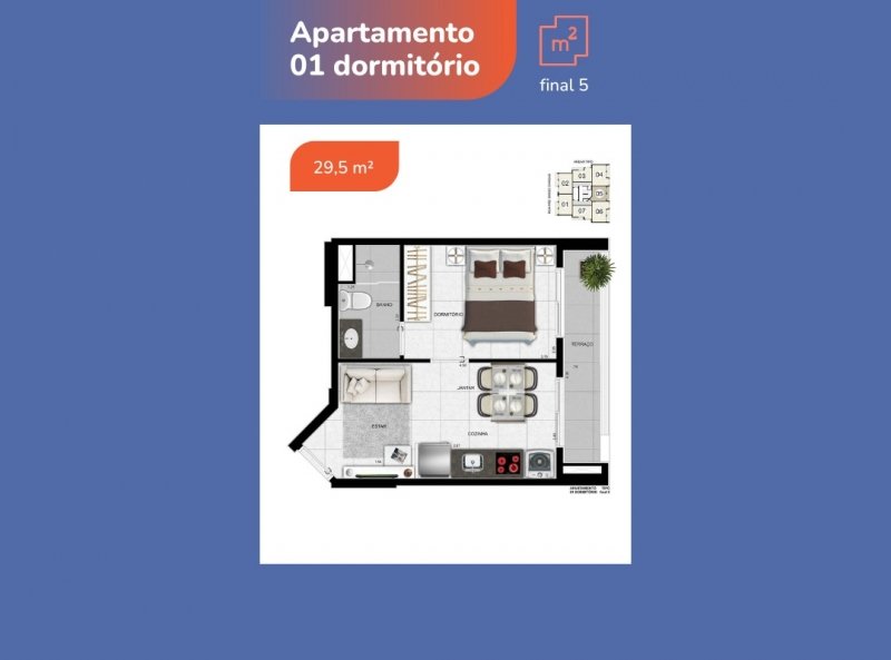 Empreendimento com torre única, com unidades de 1 ou 2 dormitórios.